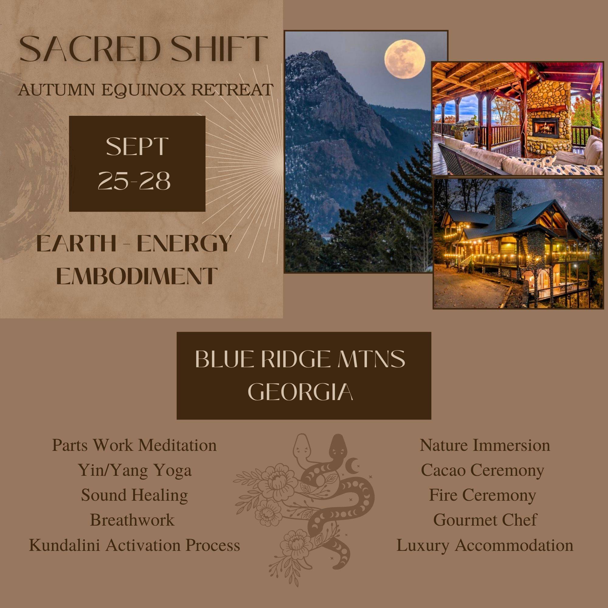 SACRED SHIFT SEPT 25-28 BLUE RIDGE MOUNTAINS, GEORGIA: Ready to close the Year of the Snake with Sacred Power? Step into Sacred Shift, a transformative Kundalini retreat aligned with the Autumn Equinox—a time of natural balance between day and night, body and spirit. This immersive experience is designed to open the flow of higher consciousness and ground with the rhythms of the Earth. Four days of unplugging, nature, and sisterhood as we slither into Yin season. Learn more herehttps://hartflows.com/sacred-shift-retreat/ with Dre